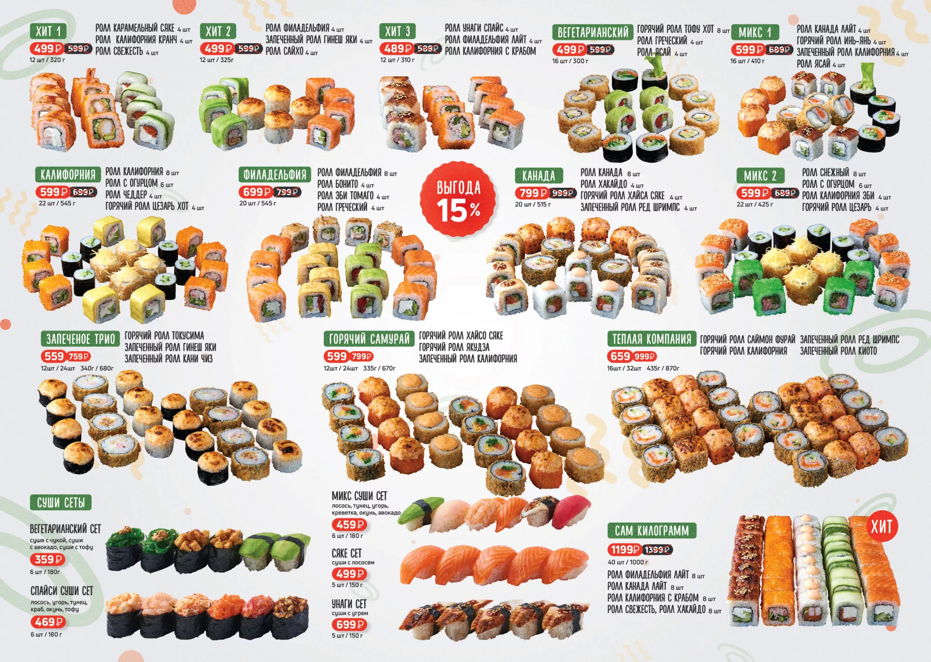 Оформление меню суши-бара «Roll Wok Club» в Заозёрном